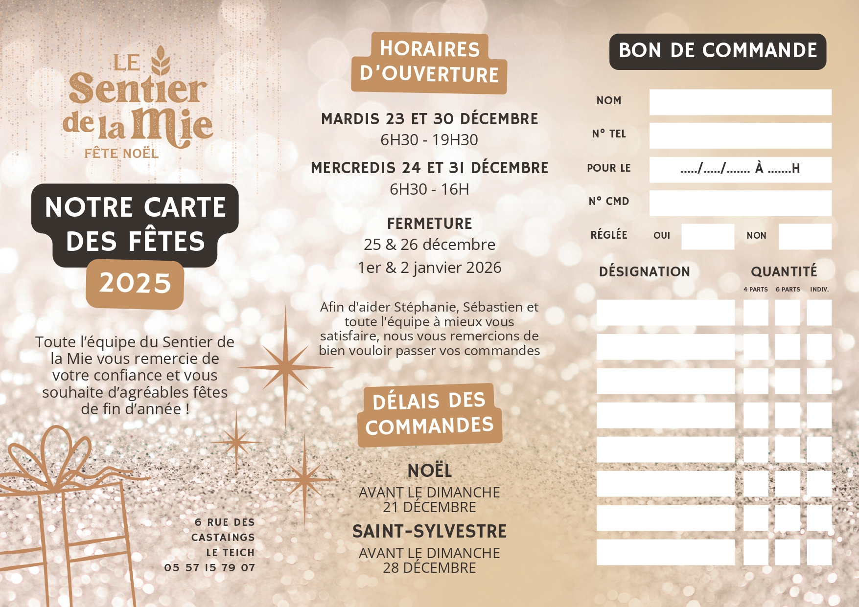 Bienvenue au Sentier de la Mie, une boulangerie chaleureuse nichée au cœur de Le Teich ! Chez nous, l’amour du savoir-faire artisanal et la passion pour la qualité se conjuguent pour vous offrir une expérience gustative inoubliable. Notre sélection de produits faits maison s’étend des délicieuses baguettes croustillantes aux viennoiseries fondantes, en passant par des pâtisseries exquises qui émerveilleront vos papilles. Pour ceux qui recherchent une pause gourmande, notre offre de snacking propose des options savoureuses et équilibrées. Nous sommes fiers de satisfaire tous les palais, y compris les amateurs de cuisine végétarienne, avec nos gammes spécialement conçues pour répondre à vos préférences. Au Sentier de la Mie, chaque création est élaborée avec soin et dévouement, dans le but de vous offrir une expérience culinaire unique.